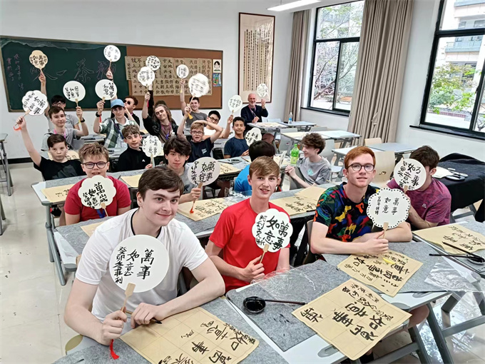 为了让远道而来的英国同学深入全面地体验杭外的校园氛围与文化,学校为来访师生们安排了丰富多彩的活动。刘江锋老师为来访师生开设了书法课、美术课,通过指导大家进行书法创作和绘画,让同学们感受中国传统文化以及博大精深的书法、绘画艺术。