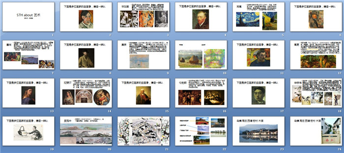 在绘画艺术板块,同学们看各位画家的自画像并猜测这位画家的姓名,由我们小组简单介绍这些画家。我们小组准备了一些有代表性的画家,如文艺复兴后三杰之一——拉斐尔;后印象派画家梵高、高迪、塞尚;中国画家徐悲鸿、吴冠中等。通过简单介绍他们的生平、绘画风格和画背后的故事后,同学们对这些伟大并富有个性的艺术家们有了更深的了解。在建筑艺术板块,我们对古镇建筑和桥梁建筑进行了分辨。在食品艺术方面,我们对日常生活中常吃的奶制品进行分类,并准确介绍了它们的名字。最后是行为艺术,观看了印度的国庆阅兵,赞叹于人体的美妙。