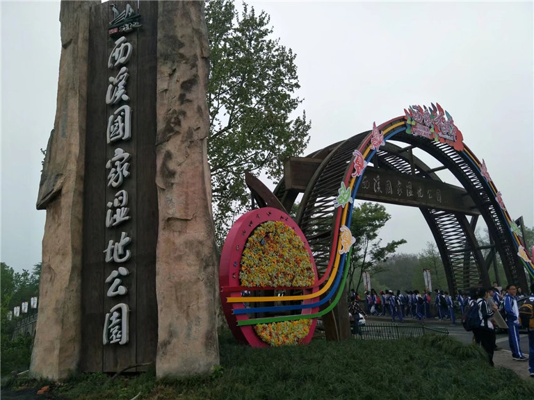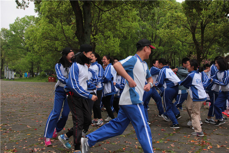 路上,笑语不断。马路旁,是冒着雨护送我们的老师和保安叔叔。蓝、白、黑相交错的队伍,不失秩序,也如同春一般,透出勃勃生机。樱花瓣飘舞在风中,我们走走停停,时不时加些小跑。每走一段路,便有大预班的学长学姐在做向导,他们举着KT板,上面画有卡通,写满加油鼓劲的话语。一个半小时的步行后,各班抵达西溪湿地。