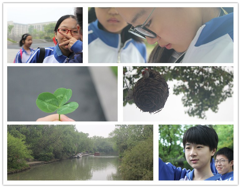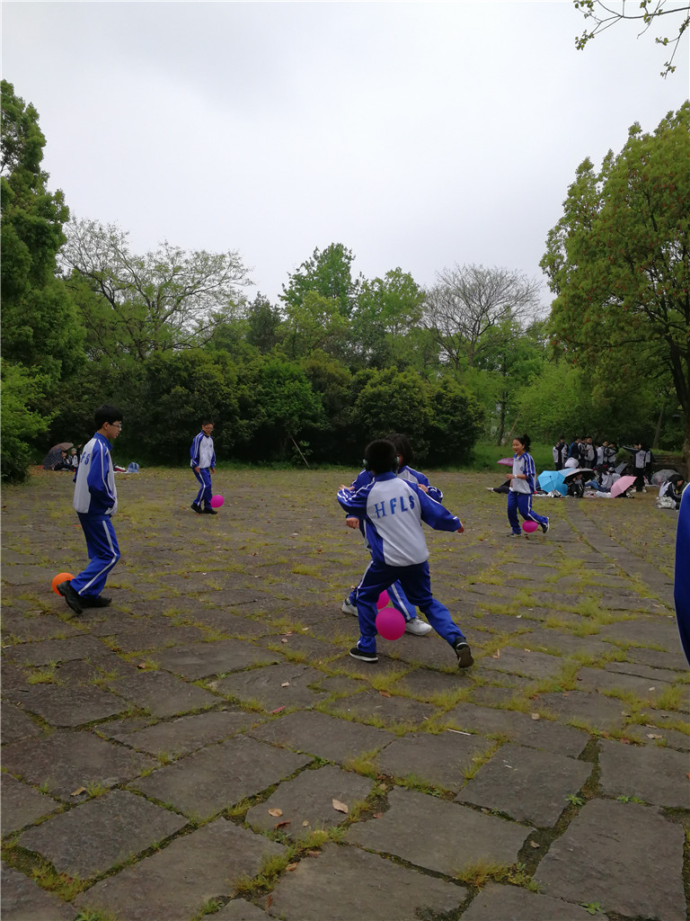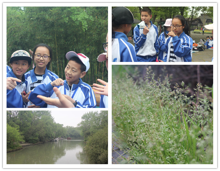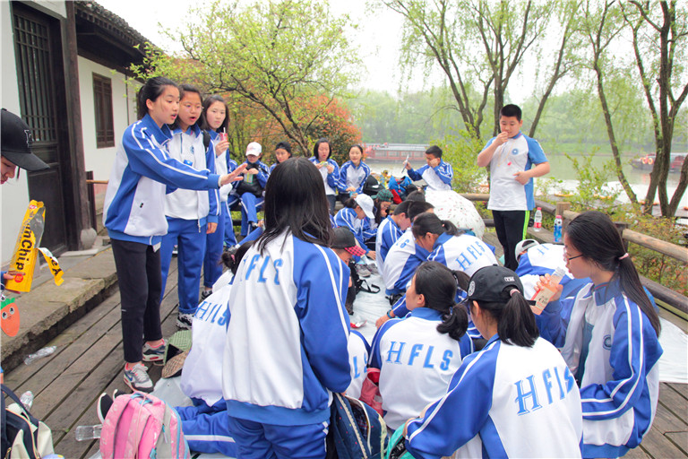 各处铺下垫子,或在亭中,抑或在木墙黑瓦的房屋后。同学们有拿出一大袋零食的,粘得满脸零食屑;也有的掏出纸牌,一桌桌地围着,带动起热闹的气氛。各式各样的食物堆在垫子上,边吃、边玩、边闲逛着,别有趣味。大预班的学长学姐精心为我们准备了“Scavenger hunt”寻物游戏。任务也有各种形式,比如和HFLS的保安叔叔合影,找到两只青蛙宝宝,寻找穿奇装异服的大预班学长学姐等。还有各班自行组织的游戏活动,如我们初一(4)班的同学组织全班展开了湿地追逐。春意盎然的西溪湿地,因那些青春活力的身影,更添加了一份春的气息。耳畔,传来的是摄像机快门的咔嚓声,同学们的笑声,奔跑的脚步声……那瞬间,我们也忘记了疲倦,在繁花之间享受春的漫步。