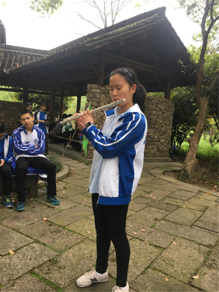 抵达目的地,各班就地扎营后立即热闹地组织起了小型联欢会。青葱郁郁的树荫下是我们的舞台,大家各显才艺,伴随律动的音乐起舞,或是吹奏长笛,荡开时而轻快时而悠扬的音符,在西溪湿地天然的阔大背景中焕发出青春洋溢的光彩。集体活动告一段落,但踏青尚未正式开始——怎能辜负了这舒适的微风细雨和盎然春色?三五成群地聚在一起,我们纷纷踏上了寻访春意的漫步之旅。