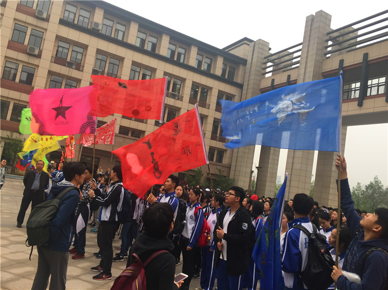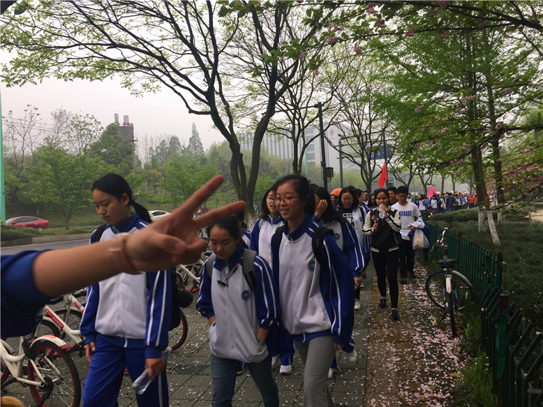 一时间,一眼望不到头的行列在马路一侧形成了一道靓丽的风景。君不见杭外学子骈驾行,来势浩荡御风尘。有举旗舞弄者,奋力突进者,媚笑尬聊者,高歌凌云者。装备也尽善尽美,这儿有人带了个小音箱不说,那儿还有背了把吉他的……两旁还有学长学姐,双臂开张,极力喝彩,手中执牌,上书“加油”。写到此处,感动之情不禁为他们的好心浮散开来,不知所言。