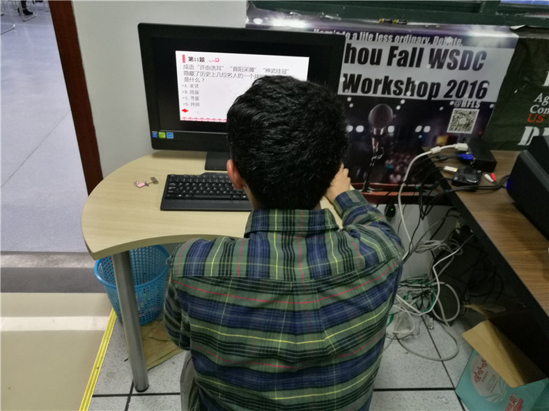 确定题库之后,一边,负责做PPT和电脑计时的同学开始了紧张的工作,负责同学一下午一下午地泡在电子阅览室,只为做出最完美的、契合我们反复斟酌的、甚至是随时接受改动的程序与规则;一边,出题组同学同时开始准备仲裁团的工作,查阅大量的资料,准备每一道题、每个选项的解释,确保题目的客观性与绝对准确性,还对题目的表达方式进行反复修改;另一边,主持人们也开始准备主持词,一遍复一遍的字斟句酌,一遍复一遍的情感酝酿,只为了追求对知识竞赛的最好呈现。在准备工作的后期,所有同学则开始了紧张的彩排与预演,模拟场上随时可能出现的突发情况,力求找到全组成员密切配合的绝佳方案。无数次的排演,无人言累。