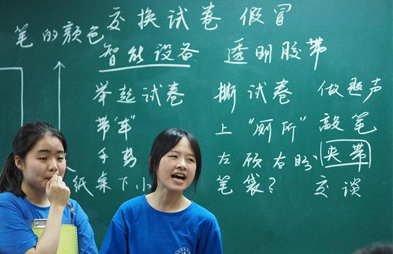 本次班会第一阶段进行的就是考试,监考老师和监控分别由几位同学自荐担任。他们信心满满,坚信自己会让作弊的同学无所遁形。从跨入微格教室那一刻起,考场变得分外安静。事先知道有大规模作弊行为会出现的监考老师们始终用火眼金睛注视着正在微格教室发生的一切,而考生们也模拟出了各种逼真的考试状况以扰乱视线,考验监考组的眼力。