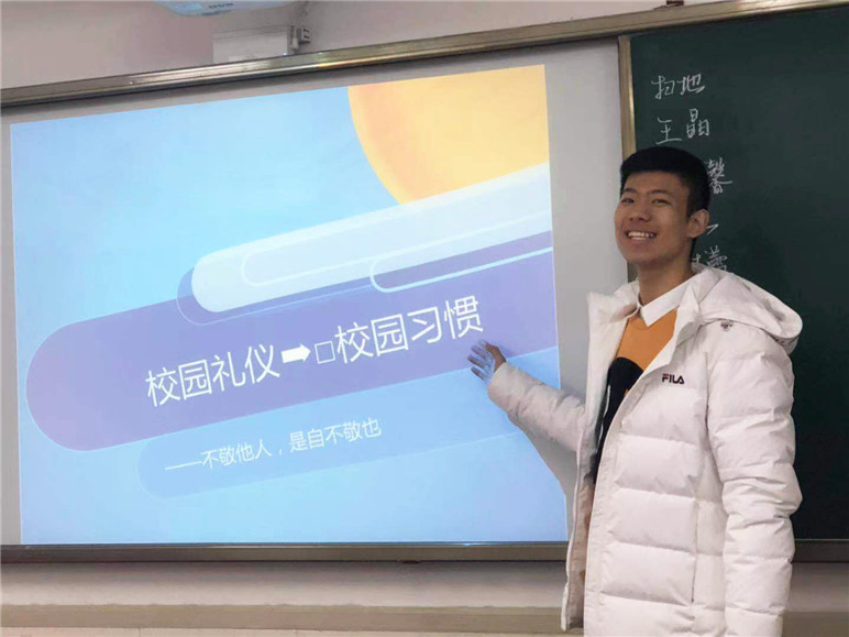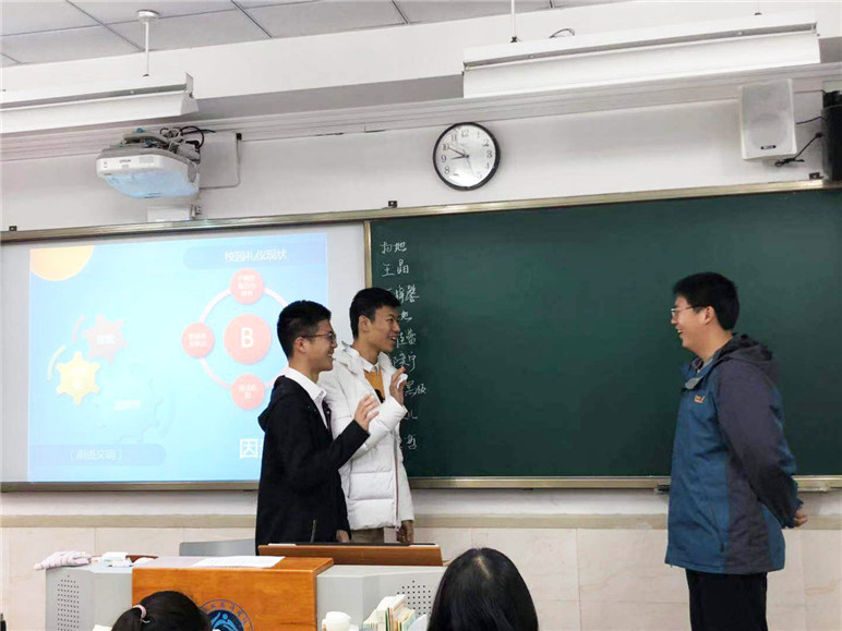 班会课由一个小游戏开始,每一个被抽取到的同学都要来分享一下自己身边的文明礼仪小故事,在愉悦轻松的氛围之下,同学们渐渐开始思考生活中的礼仪细节。