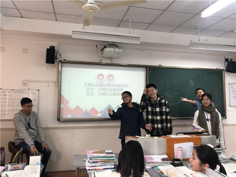 第三个环节是辩论,辩题是:文明礼仪主要靠自律还是他律。正方队长江俊言带领俞欣怡,谭舒心,石锐主张文明礼仪主要靠“自律”,反方队长王中音带领王怿添然,陈一帆,来森楠认为文明礼仪主要靠“他律”。他们针锋相对,掷地有声的发言和反驳激起了台下同学一阵阵激烈的掌声,引起了很大的共鸣。不同于普通的辩论,这场辩论赛还有一个最鲜明的特点就是:辩论双方全程必须保证自己措辞文雅合乎逻辑,不可有粗鄙的词汇掺杂。看似简单的要求在真正实施的过程中却也出现了参差的差错,可见,文明绝非易事。