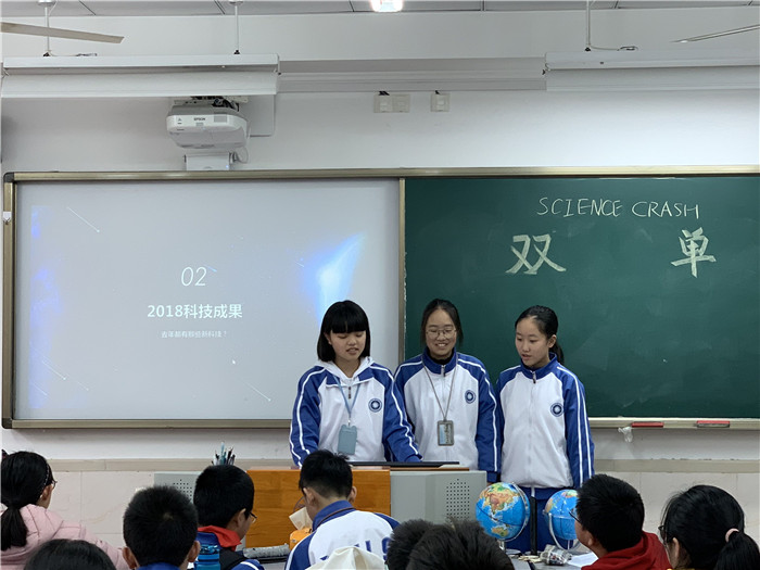 这一次的班会由蒋翌楠、方言、陆林轩三位同学负责。她们提前做了精心的准备。首先,她们围绕校内各年级活动,给大家作了一次初一年级相关活动预告。接着,她们结合课外知识,通过各种图片漫画给同学们介绍了很多最新的科技发展前沿。当她们介绍5G的时候,全场都轰动了,恨不得立马就能体验到最新技术带来的便捷。