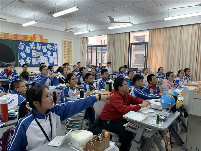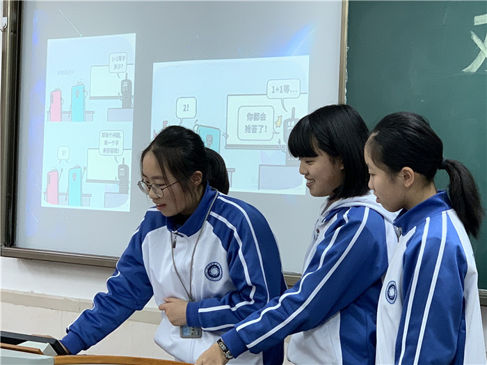 之后是同学们喜欢的分组有奖问答环节。蒋翌楠等三位同学提前将全班同学按学号分成了单双两大组,并采用了游戏的方式让我们巩固新学到的知识,每次答对题目,全组都欢欣雀跃。最后的开放性问题,不管答得如何,都有小奖品鼓励,目的是让更多同学能更加积极主动地投入到活动中。