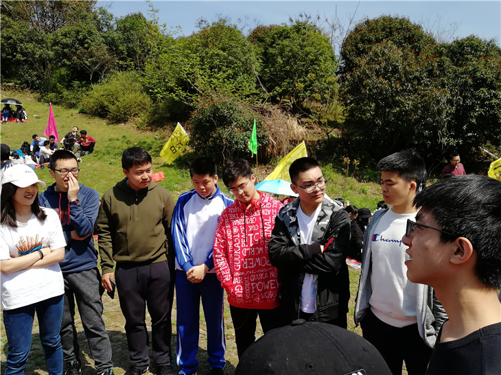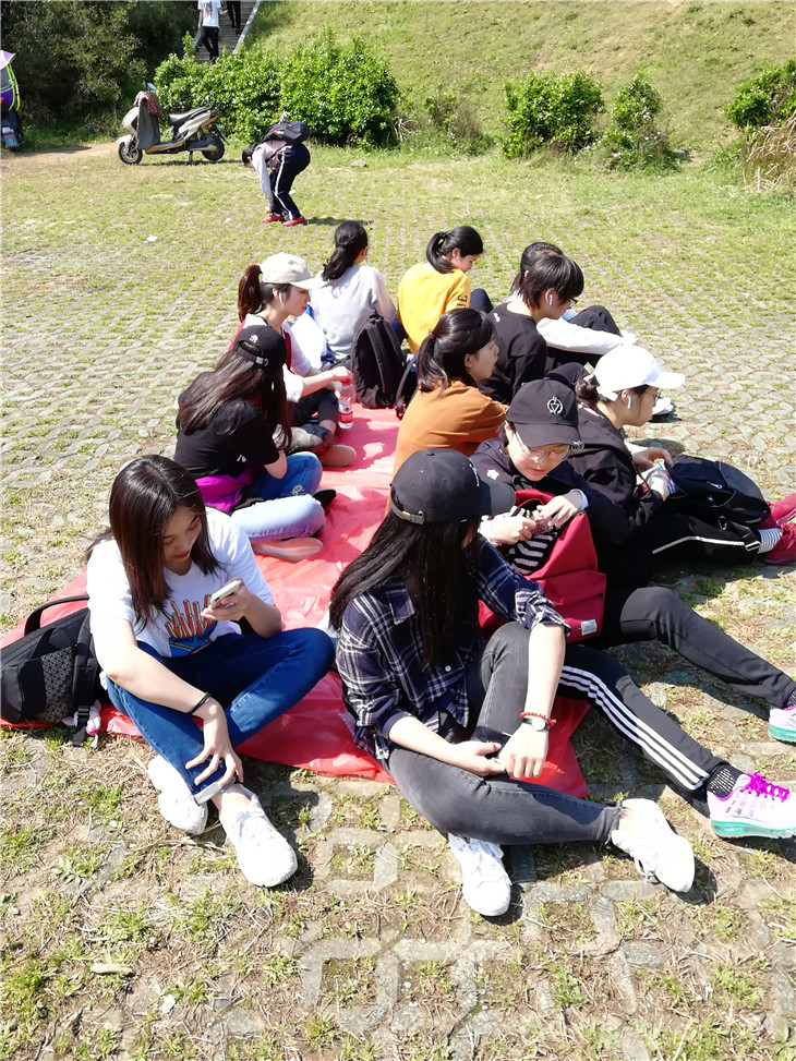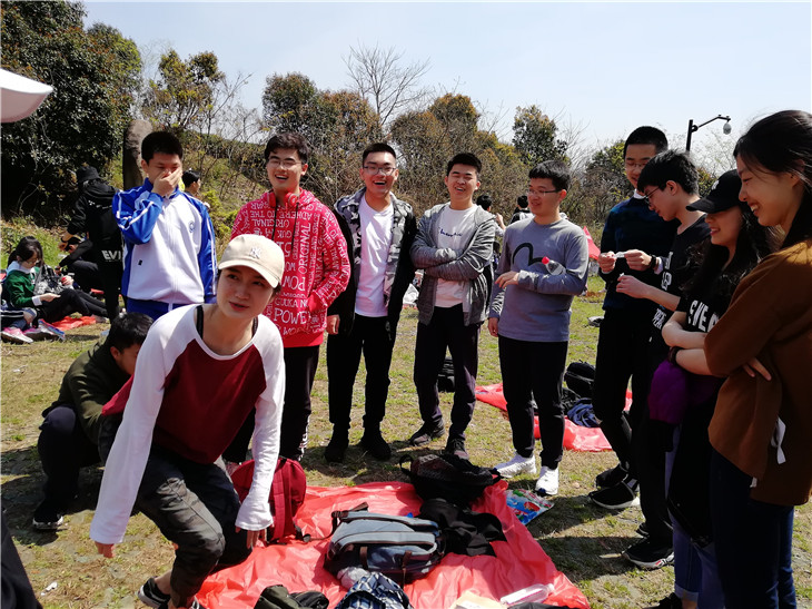 这次漫长旅程的终点是山中的水库——光明寺水库。水库虽然不大却也称得上是一处美景,因为是春天,湛蓝的湖水被翠绿的无名野草环绕着。随着阵阵清风拂过,湖面上的波光随着野草一起舞动。来自HFLS师生的欢声笑语打破了山中寂静,给原来平静的宛如画卷一般的地方增添了之前不曾有的活力。我们班在靠近湖水的斜坡脚下圈了一块地盘,打算在此休息。等大家都从之前的山路中缓过来之后,耐不住性子的我们打算在饭点之前玩玩之前规划好的国王游戏。游戏很简单,每一轮都会有一个国王,其他人必须遵守国王下达的指令,也就是惩罚。游戏的进程很快,很多人都被受到过类似于唱歌跳舞跑步之类的惩罚,甚至有一两个幸运儿被不断地抽中。几轮下来也到了我们非常期待的饭点。