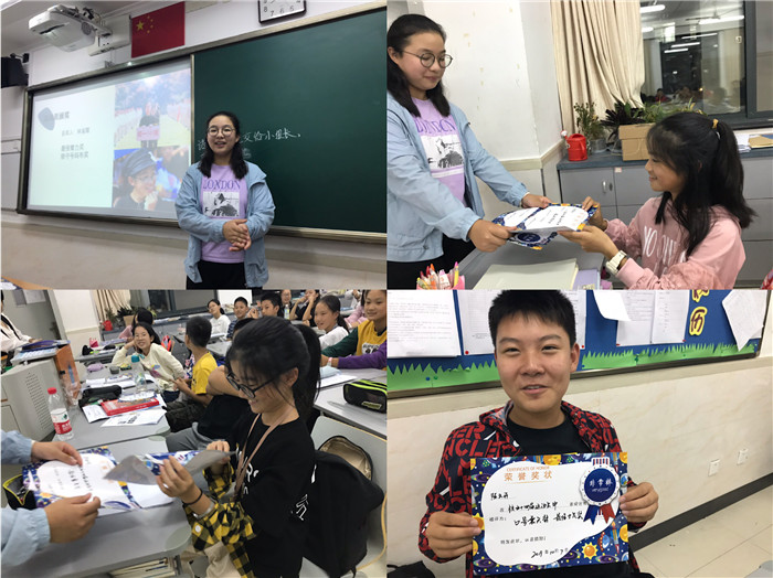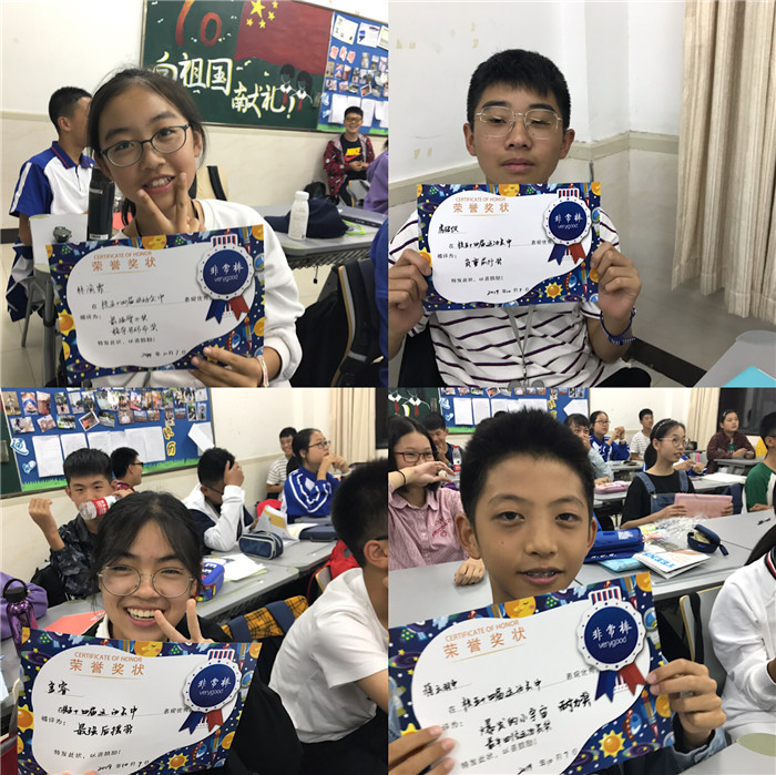 10月7日的班会课上,初一(4)班举行了班级运动会颁奖礼,为积极参与运动会为班级做出贡献的每一位同学颁奖。我们的颁奖很特别,奖项由同学们设定,颁奖词也是大家为自己心目中的“英雄”量身定制。班会课上我们还一起重温了运动会中那些激动人心的场景和令人感动的点滴小事。