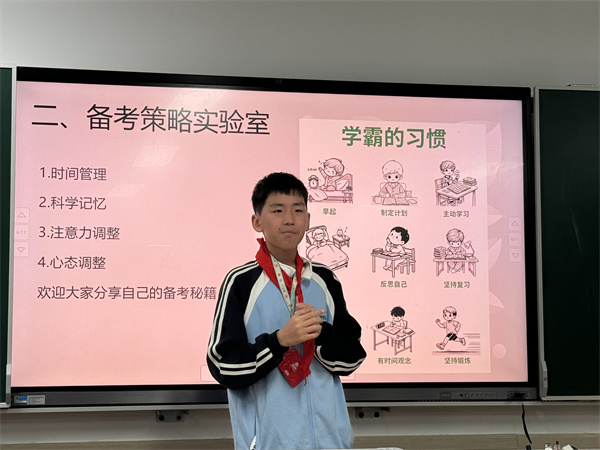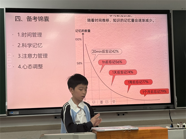 刘思涵同学分享了他的记忆妙招。他提出良好的学习环境是科学记忆的有利条件,呼吁同学们共同营造安静、良好的学习氛围。
