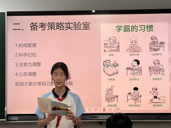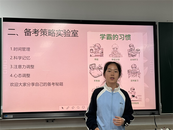 姜语晴同学分享了她的时间管理方法。她强调要合理利用碎片化时间学习,启发同学们平衡各方面时间。
