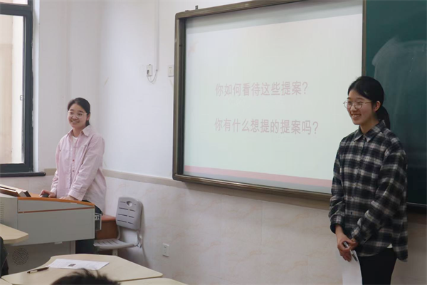 两位主讲人首先向大家简单介绍了两会的基本信息,重点聚焦在两会的作用和意义层面上。接着,她们带领同学们分析了2025年两会中引人思考的一些提案,比如:人大代表李杨建议推迟中考分流,将普职分流时间从初中后移至高中,并设置1-2年综合观察期;人大代表汪玉成提议每年多放三天假,并减少调休“凑假”,让人们更好休息;人大代表殷其龙指出网约车定价不应低于出租车,以维护市场秩序等。
