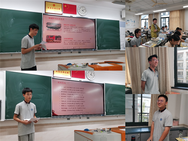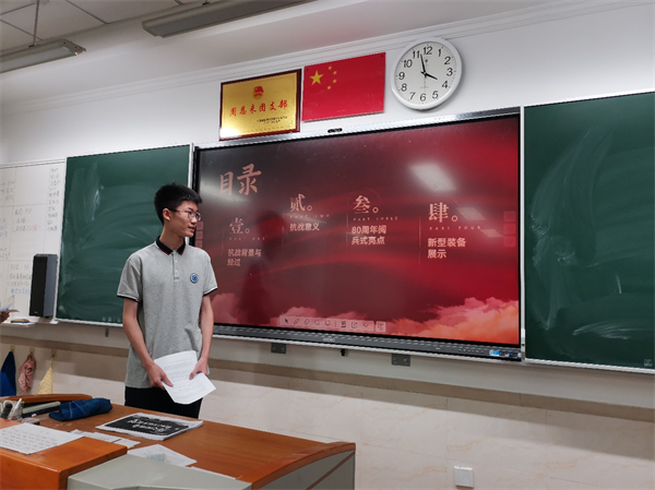 9月3日,北京天安门前进行了一次大规模阅兵仪式,纪念抗日战争胜利80周年暨世界反法西斯战争胜利。随着一个个整齐的方阵走过、一辆辆新式坦克开过,不禁让同学们意识到如今的和平来之不易。因此,高二6班开展了一次关于回顾抗战历史、深谙胜利意义以及共筑强军之梦的主题班会。