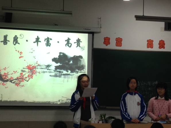 今天我们举办了一场以“善良,丰富,高贵”为主题的班会。