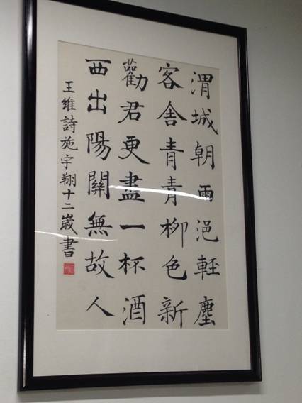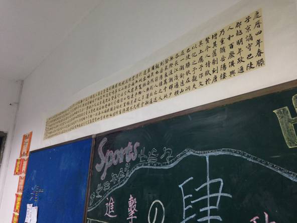 再说到我们的班级,也有浓浓的文化气息。我们班里有许多书法爱好者,其中有三幅作品就张贴在墙上。有《岳阳楼记》《送元二使安西》和《黄鹤楼送孟浩然之广陵》。三位都非常精益求精,字体端庄细致。他们的努力也是我们这个教师洋溢着浓浓的古诗词文化。
