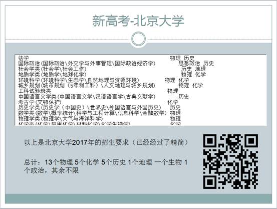 接下来,金骁枫同学以北京大学为例,向我们解释了大学具体专业对于学生选考科目的要求。通过一个简单而信息丰富的表格,我们对各个大学的需求有了初步的了解。如在北京大学39个专业中,有13个专业要求选考物理,5个专业要求选考化学,5个专业要求选考历史,1个专业要求选考地理,1个专业要求选考生物以及1个专业要求选考政治,其余不限。让大家有了一个直观的认识。