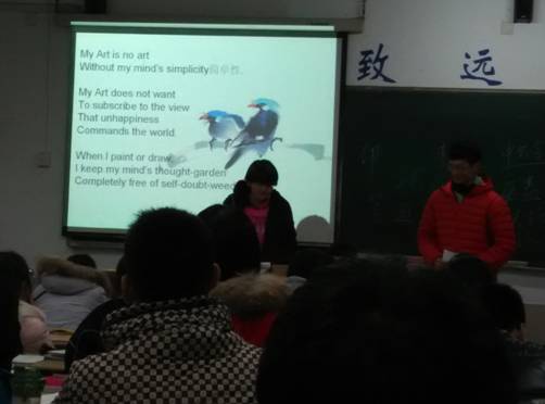最后一环节,同学们开始讨论什么是艺术,王扶桑和陈一清同学为大家带来了一段声情并茂、发音标准的《what is your art》英语诗朗诵,诗歌的最后一小节“True, in my Art I want to see/The face of earth’s beauty./But I want to see/The heart of Heaven’s Divinity/More, infinitely more.”同学们渐渐感受到了艺术的真谛。班会的最后,陈明、屈波和吴子昊同学给大家阐述了自己对于艺术的理解,尤其是吴子昊同学的发言,角度十分新颖。