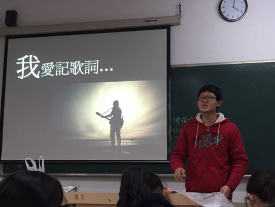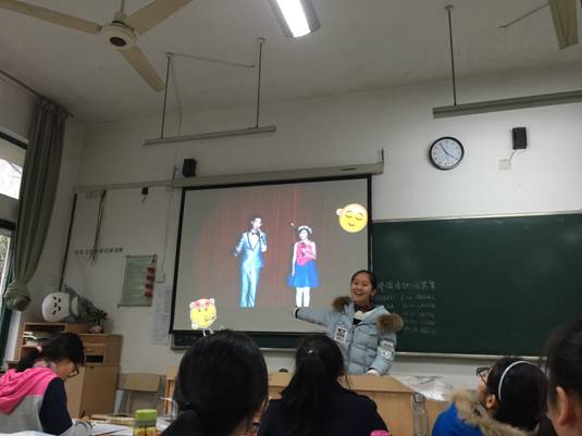 最后,是最欢快激动的“我爱记歌词”环节了。主持人在PPT上事先打好了歌词的片段,从中删去了几句,同学们举手抢答,还有糖果作为奖励。全班同学以这种方式,向艺术节致以我们独特的问候与敬意。