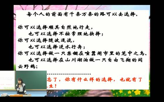 随后主持人向每位同学分发信纸,请大家写下对一年后或者是未来的自己想要说的话,并且承诺会好好保存这些“稚嫩却坚强”的梦想,直到我们再次相聚时,再将它们开启。已确定赴国外留学的李亚儒和华姗姗同学与我们分享了她们写给一年后自己的信,虽然没有华丽的辞藻,但对自己的殷切期待,特别是那份发自肺腑的对同学之间浓厚情谊的留恋,深深地感染了在场的每个人。这是她们对未来的展望,更是依依不舍的道别,感人至深的寄语再一次将班会课推上了高潮!在这伤感的氛围中,班主任焦老师表达了自己的感动,并结合“未选择的路”这一主题,声情并茂地朗读了她给同学们的寄语:“你不能选择生命的长度,但你可以选择控制它的宽度;你不能左右天气,但你可以选择改变自己心情;你不能选择容貌,但你可以选择展现笑容;你不能控制他人,但你可以选择把握自己;你不能预知明天,但你可以选择利用今天;你不能样样顺利,但你可以选择事事尽力;你不能……,但你可以选择……”