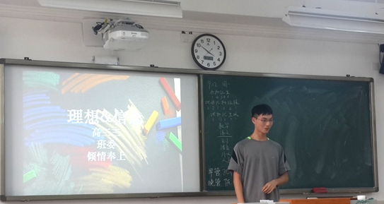班会最初,王扶桑以中国新歌声中两位选手与导师的对话为引,叙述了自己对于理想和信念的理解,也就是对于真实自我地不懈寻找和对目标地不止追求,同时,这也为我们的班会带来了一个引人入胜的开头。开场之后,大屏幕上出现了班委们精心准备的采访视频,老师们在采访视频中各自抒发了对理想和信念的理解,并描述了自己的高三生活。