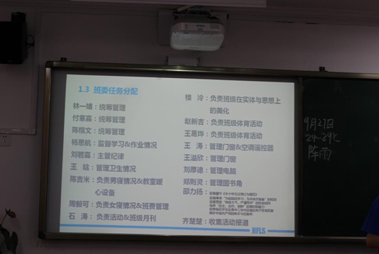 9月26日新班委向全体同学介绍各班委的职责,宣布班级管理细则。
