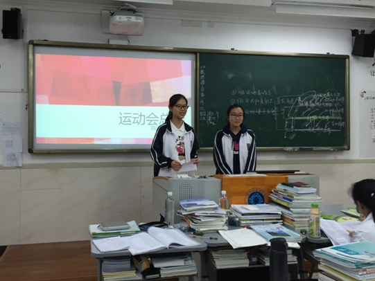 接着运动员短跑项目男女生代表、长跑项目男女生代表分别上台发言,讲述了自己比赛前的训练情况,赛场上的心路历程,赛后的感受,赢得了大家的一阵阵掌声和喝彩;后勤、志愿者、宣传组、入场式、阳光伙伴、广播操的负责同学也分享了自己的感受。大家都在不同的岗位上积极参与到运动会中。最后班主任刘老师为前前后后忙活了一个多月的运动会做了精彩的总结,让我们体会到了更多。