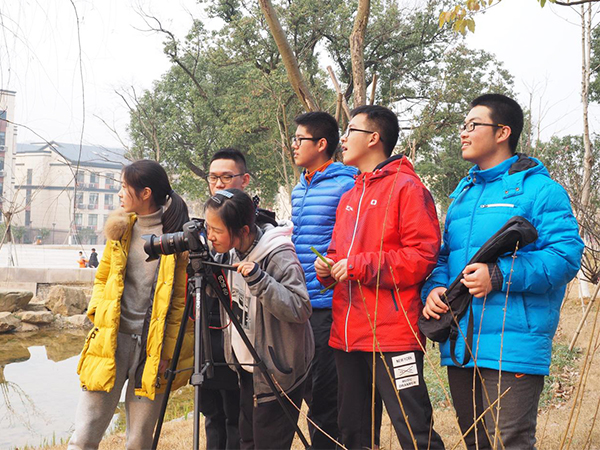 活动开始后,各小组从不同的路线出发,大部分组都是先找一个合适的集体照拍摄点,然后就近寻找春色。或许是全班同学的默契,或许是对于校园的一致感受,最终全班都汇集到了校园的圆形广场,不得不说广场附近的环境还真不错,有环绕着半个广场的池水,池水中翠绿的植物与水边常青的树木相映成趣,给人焕然一新的感觉。