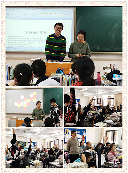 当天班会课,我们收集了前几届知识竞赛的真题,并以小组为单位进行答题。在如火如荼的竞赛过程中,我们不仅体会到了知识的力量,而且也开阔了自己的视野。科技并不在无法竣工的巴别塔之上,科技正是我们日常生活中触手可及的一部分。这些题目中不乏人人都能答出的:发现行星运动定律的是德国的开普勒;却也有考查鲜有人知的冷僻知识的:同学们都没想到夏天穿黑色衣服才最容易被蚊子咬。在这四十分钟的头脑风暴中,同学们踊跃举手,纷纷为自己小组争取优势。即使是在班会结束之后,一些同学仍在对题目进行讨论。