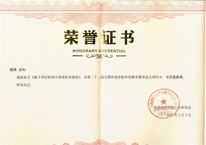 在2022年全国外国语学校论文评比大赛中,我校六位外文教师表现出色,其中,洪琳荣获一等奖,倪骕骦、王灵滨、陆旻荣获三等奖;倪玮、俞佳智荣获优秀奖。