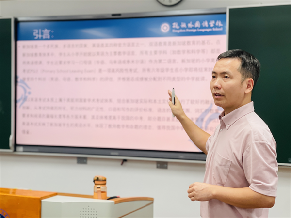 最后,副校长李力分享了学术论文写作经验,以新加坡PSLE(小学离校考试)为研究对象,分析其英语考试特点及对我国外语教学的启示。他剖析了PSLE注重语言规范性、多元技能、批判性思维和在真实情境中使用多题型与丰富语篇等特点。同时,他毫无保留地分享了与编辑修改论文的过程,强调论文写作务必严谨,鼓励老师们在科研道路上持之以恒,经历从“望尽天涯路”到“灯火阑珊处”的积累与突破的蜕变历程。