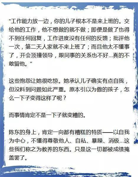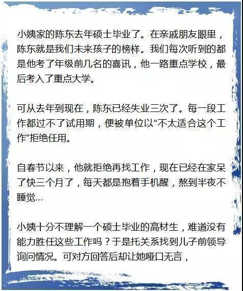 经常有家长在微信上与他交流孩子的学习问题,很多家长都希望孩子将来长大以后能够有一份好工作,而父母认为孩子想要好工作就必须要努力学习,所以从小就对孩子学习抓得紧。但是在这个过程中,家长却为了追求结果,而忽视了孩子自身的教育。下面这个硕士生的故事,希望对家长教育孩子有所启发!