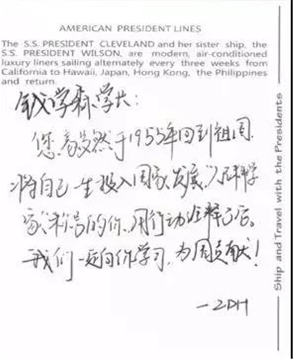 今天,让我们回顾钱学森为了报效祖国而奉献的历程,共同缅怀钱老,缅怀他自学生时代就立下的科学报国之志,缅怀他始终坚持为民族复兴选人生。