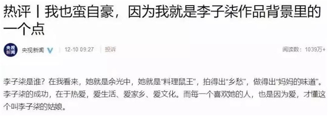 央视新闻发布的评论文章《我也蛮自豪,因为我就是李子柒作品背景里的一个点》里这样评论李子柒: