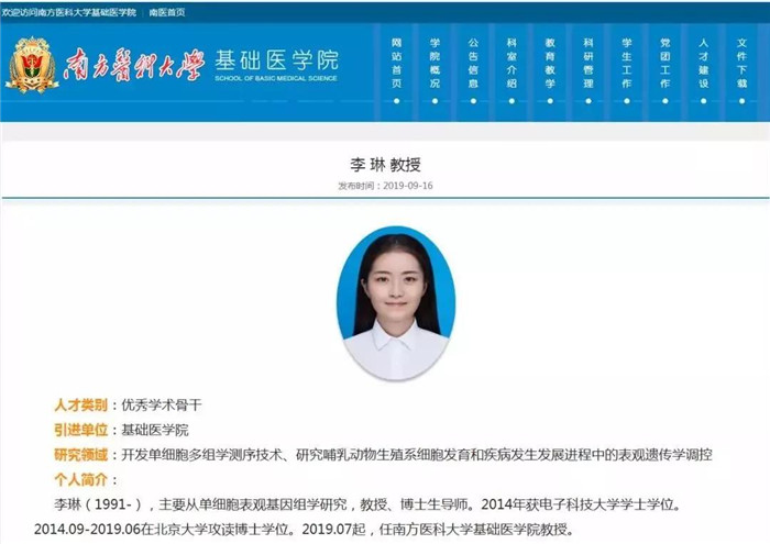 南方医科大学基础医学院宣布,北大博士李琳于2019年7月开始任该学院教授,并担任博士生导师。