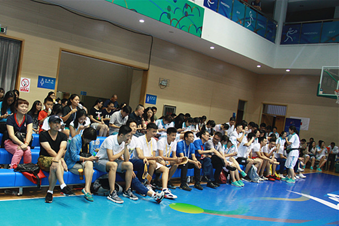 开战在即,在观众席的江苏亲友团成为一道亮丽的风景线。记者采访了江苏队的亲友团了解到,队员家长们自发组队赶到杭州,拉起自制横幅为儿子呐喊助威,希望顺利打响第一枪。虽已是晚上最后一场比赛,乏力疲惫之感丝毫不影响杭州外国语学校学生观众的热情,释放青春,燃烧吧!