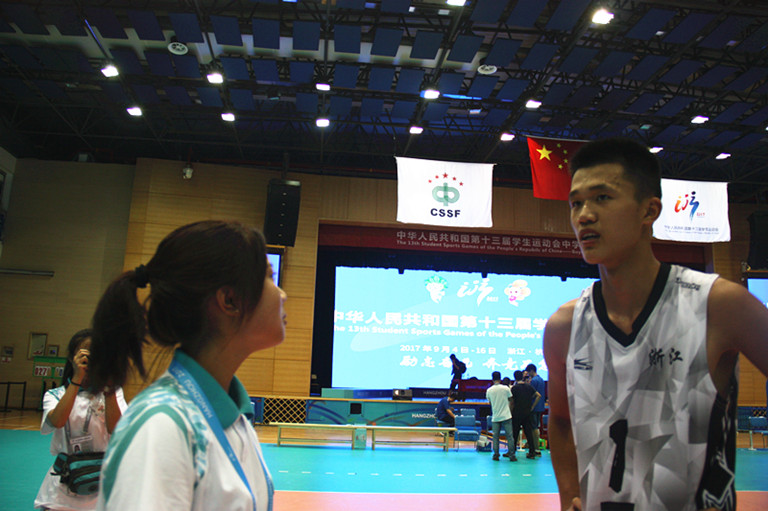 随后新闻中心的志愿者采访到浙江队的1号球员,他坦言现场观众的加油呐喊声起了很大作用,并代表全体队员向对这些观众表示由衷的感谢。在问及本场比赛表现时,他说道:“打得非常尽兴!第一局获胜之后有些放松,进攻没有发挥好,所以输了第二局。后面两场比赛的氛围特别好,我们也打得特别带劲。真的特别感谢现场的观众!”