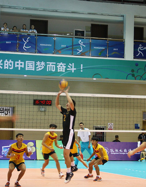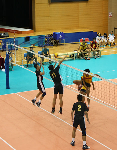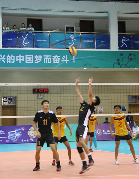 9月9日下午,杭州外国语学校体育馆喝彩阵阵,掌声迭起。没错,此时正在进行的是中华人民共和国第十三届学生运动会中学组男子排球第十四场比赛:上海队对战海南队。