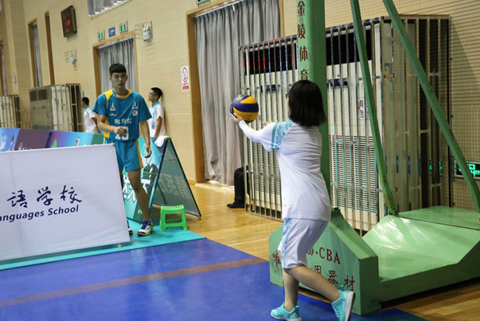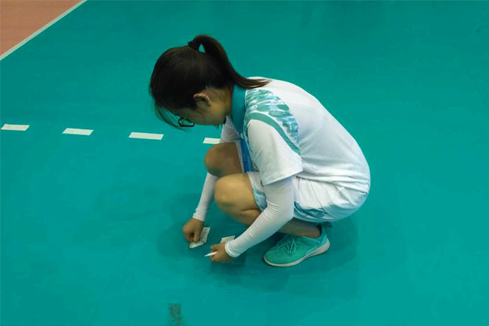 捡球志愿者负责赛场上的五颗球,六名志愿者分别在场地四周进行传球衔接工作,擦去比赛用球上的汗渍并及时以击地传球的方式传给球员。快擦志愿者在比赛过程中根据裁判的指令快速进入场地擦去地上的汗渍,而擦地志愿者则是在每局比赛前后对整个场地进行清理。器械志愿者需要对比赛用的排球、记分牌等物品进行管理,并及时对防护栏进行调整。