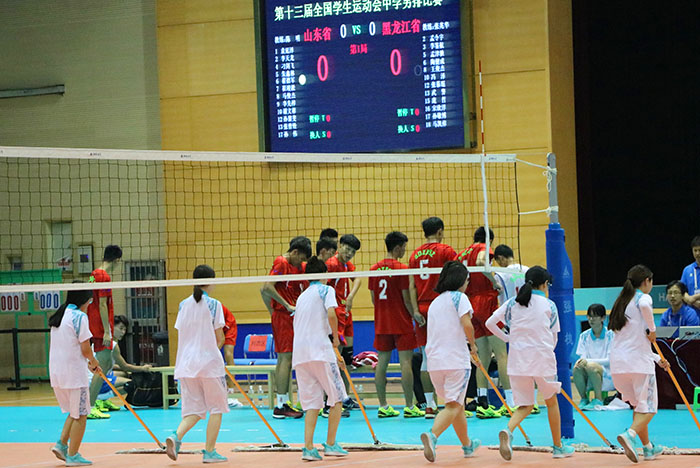 今天是中华人民共和国学生运动会中学组男子排球比赛的第五天,志愿者们依旧以饱满的精神为赛会进行服务。在场地中,有一群专门负责捡球、快擦、擦地和器械管理的志愿者们。