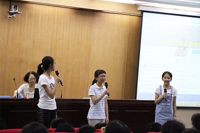 徐老师一开场便用流利的英语向大家问候,与同学们展开热情的互动。随后,徐老师就如何学好英语,给出了自己的意见和建议,还邀请了她的学生来到讲座现场。他们从原创英文诗歌朗诵到名人演讲,从电影配音到英语歌曲,还带来了别具风格的音乐剧表演,十分精彩。他们以自身的学习经验勉励着同学们要制定好学习目标,抓住机遇,努力奋斗。