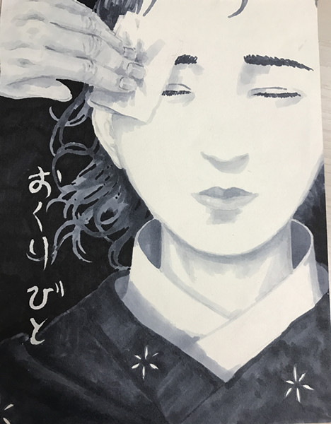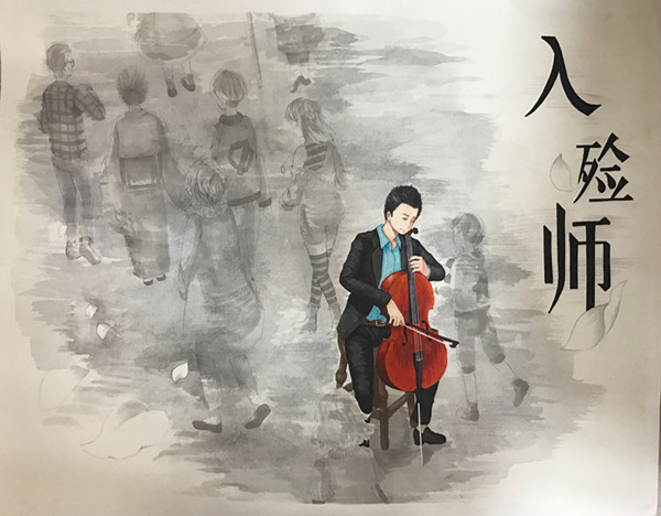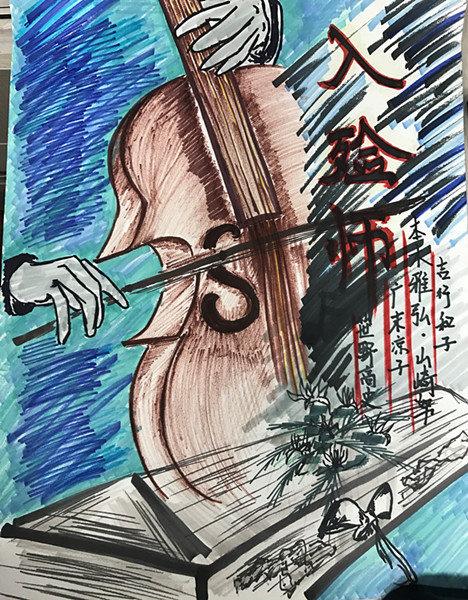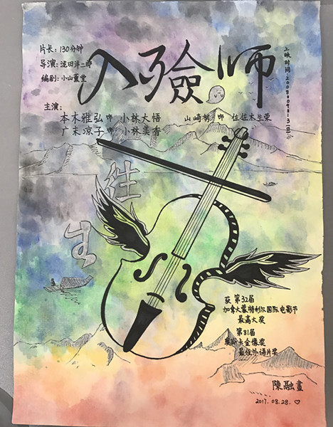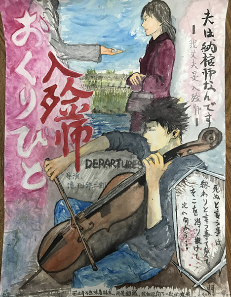 我的海报是手绘的,我之所以选择手绘有两个原因,首先,我的p图技术是到了连美图秀秀都无法拯救的地步。其次呢,我觉得用电脑做出来的海报图片比较容易撞,我看了网上许多相关《入殓师》的海报,不管是日本的、韩国的,还是它在欧美的上映海报,大量选择了男主角拉大提琴这个画面。第三嘛,这样一部让人深思和感动的电影,用自己的手画出来更能够表达出,用画笔一笔一画去画出我的理解和看法。