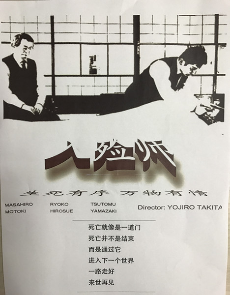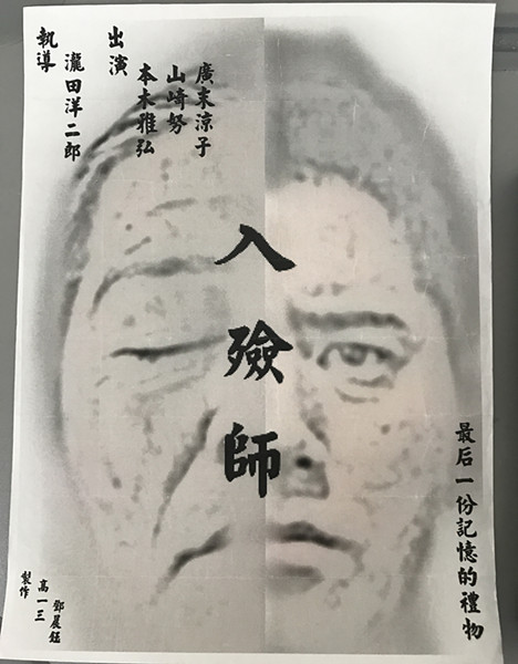 因是一部日本电影,海报上选用了和服,死者的脸则能剧面具。以黑色为背景,整个海报看起来肃穆、庄重。主体是一位逝者,但是我希望他是在代表无数逝者。