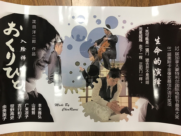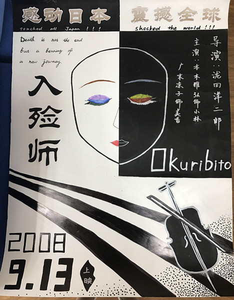 第81届奥斯卡金像奖最佳外语片——《入殓师》是老师配合九年级下“人与自我”之“讴歌生命”这个单元话题推荐给我们的一部影片。影片真诚、细腻,看似在面对死亡,实则在探讨每个生命的必经历程和对待生命应有的态度,传导着一种真挚、尊重、从容、优雅、富有责任的生命观。暑假里,老师给我们布置了一系列研讨作业,其中一项是 “请你为《入殓师》制作一份海报,并阐释你的设计理念。” 开学初,我们纷纷上台展示自己的海报创意,来阐释自己对影片的独特理解。