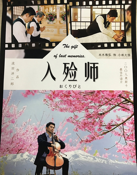 看完入殓师,我首先想到的与之相关的职业是医院的妇产科医生。这些医生是迎接新生命的一批人,而入殓师则是为人们送上最后一程的一批人,实际上我觉得,他们的工作是有相当的可比性的。然而在这个社会中,绝大部分人都选择尊重妇产科医生们,但却轻视、甚至蔑视入殓师这份职业。仔细想想,这份理应得到尊重的职业却长久以来被人们唾弃,这真的是一件奇怪的事情。回到电影上,我认为这部电影讲的是死亡,但想表达的却是生命。小林大悟让我们意识到,对待每一个逝去的生命都应该万分庄重;而对于眼前鲜活的一切,更应该认真、温柔地对待,这也是电影所想表达的一点。海报前景中的大提琴是电影中很重要的一个线索,我认为通过对大提琴的态度,可以看出小林大悟的成长。在他卖掉大提琴的那一刻,他也迷失了自我;而后来在慢慢接触入殓师这份职业的过程中,他也捡起了大提琴,当拉琴不再是一种职业而更是一种爱好和心灵的释放,当最初的慌张和恐惧随着琴声一点点散去,我相信小林得到了成长。而背景中的樱花则是日本的一个象征,美丽而易逝,某种程度上是日本人生死观的体现。