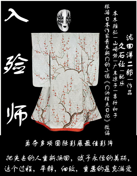 入殓师这个职业主要工作是为逝者整理仪容。“把失去的人重新唤回,赋予永恒的美丽”。画面中央是男主角为一位面容姣好的女子擦脸,这份宁静的美丽即使是已逝之人的也没有令人感到不舒服。右上角点明了电影的某个理念,即死亡就像是一扇门。而生与死两字,体现了电影的核心。其他的花纹比较偏向和风,说明电影背景是发生在日本。