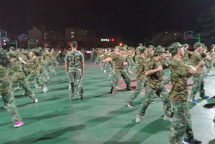 夜幕降临,我们再一次来到训练场,练习着昨天还不太熟练的军体拳。今天是对于全部九动的连续训练,许多同学任然对招式有一些不熟练。而我们在休息时间中的兴奋引起的吵闹也使我们被罚做俯卧撑。在一声声口号中,汗水浸湿了衣服,不断像地下滴落着,1,2,3……“将士们”的毅力在不断地被考验着,但是谁也没有倒下。