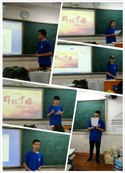 10月9日下午,趁着欢度国庆的热情还未散去。高一(5)班开展了一次班会课。本次班会围绕纪录片“辉煌中国”展开。同学们以丰富多彩的形式交流了自己的感想,还进行了激烈的知识竞赛。