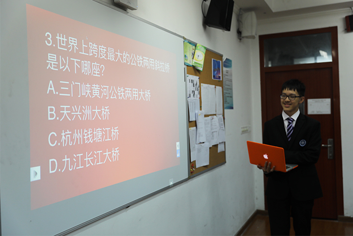 在知识竞赛环节中,同学们都踊跃抢答。虽然只有十道题,但同学们依然热情不减,题目越难,越有激情。在进行有趣问答的同时,也巩固了同学们在纪录片中学到的知识,如:中国高铁里程数是世界第一、中国的高铁里程数还大于世界第二到世界第十的里程数的总和。中国这几年的宏伟成就清晰地呈现在了他们的脑海中,他们深切地感受到了祖国的伟大。
