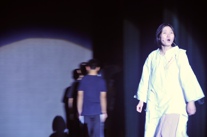 接着就是漫长的排练,背稿子,调整细节。敬业的导演陈思远和俞依奇天天带一两个组员来看我演“神经病”,逼我背稿。一开始是觉得尴尬,但不知道是我天生的还是“被逼”的,又或是两者兼有,我慢慢地不笑场了,词也终于背出来了。临近最后的演出,问题也不少,灯光,服装,我们都有分歧,时间不够来不及买孔乙己那标志性的长衫,旁白沈安安就给我做了一件。真的是特别紧凑地赶出来的一件戏服,白布做的,我和她手脚并用,在长长的布上裁下袖子,裁下领子,一针一线地缝,花了一个中午一个下午,直到去体育馆前我们还在给衣服打补丁。于是就是你们看见的我了,一身白衫的孔乙己和狂人的融合体,在大光圈下,一个人狂热又矛盾着。